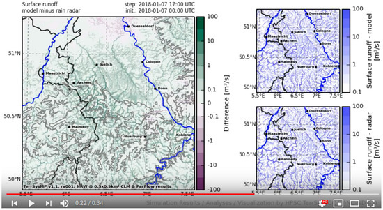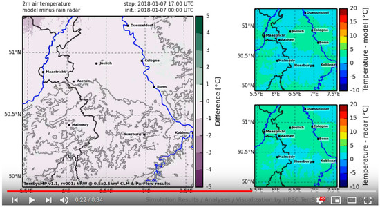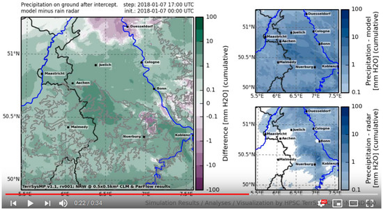 In the groundwater-to-atmosphere simulations of the monitoring system, precipitation rates and patterns are always a challenge to model [30]. In weather forecasting, incorrect precipitation fields propagate into the water and energy fluxes of the lower land surface boundary condition that are evapotranspiration and sensible heat flux, which in turn influence the aforementioned atmospheric processes through two-way feedbacks. However, in the operational setup of the weather services, this error propagation is alleviated via data assimilation, which constantly corrects the atmospheric and land surface states by means of observational data during the assimilation phase of the forecast. In contrast, in the current TMS, incorrect precipitation fields are propagated directly into the land surface and groundwater compartments, because of the fully coupled nature of the TMS and the lack of strongly coupled data assimilation capabilities across the different terrestrial compartments, which is still subject of scientific research [31,32]. In a first correction step for the NRW domain, the precipitation fields from the monitoring run are replaced by rain radar information from high-resolution X-band radar composites at the end of the monitored day. While rain rates from radar observations are also error prone, we expect an overall improvement in comparison to the predicted rain rates from NWP. The observed rain rates in the atmospheric forcing data set are then used to perform an offline subsurface–land surface hydrologic simulation in order to improve the states and fluxes, and, thus, the initial condition for the following day with the observed rain rates. This simulation is called correction run in the following sections.
