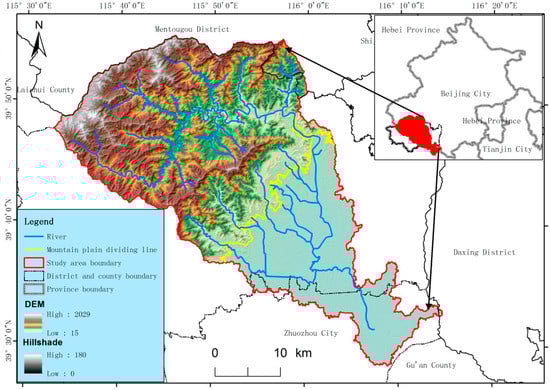 Dashi Watershed is located in the Fangshan District of Beijing, China. It belongs to the Haihe River Basin. The 126 km long Dashi River drains an area of 1267 km2 with 16 catchments. It is divided into mountains and plains by 100 m contours (Figure 1). It is characterized by a semiarid and semi-humid monsoon climate with an average annual evaporation of 1500 mm and an average annual rainfall of 700 mm. Moreover, the watershed has an average annual runoff of 95.7 million m3, and its rainfalls concentrate in July and August, accounting for 80% of the annual total precipitation. Rainfall usually occurs in high intensity and short duration events, which often leads to severe regional flood events in summer [].