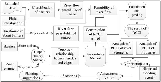 The various barriers are classified and weighted before they are identified from the river channel by the interpretation of the high-resolution image. The RCCI model is first presented in this study by modifying the accessibility method. Additionally, the passability of river flow is the key factor in the model. The RCCI model is applied to calculate the connectivity of different tributaries and river segments, and the results are validated by two historical flood events of 2000 and 2012 in the watershed. Finally, based on the scenarios’ analyses, guides for fluvial environment planning are obtained from the perspective of reducing flood hazard (Figure 2).