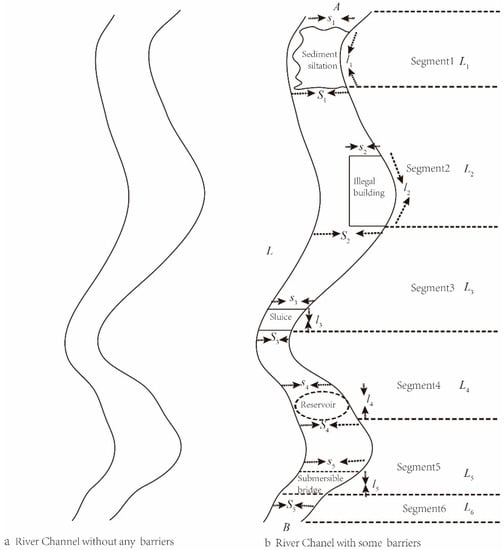 As the quantitative indicator of river channel connectivity (RCC), RCCI is measured by using an accessibility method defined by the modified traditional accessibility method. Previous researchers defined accessibility as the intensity of the possibility of interaction [,]. Here, we define accessibility as the degree of difficulty for a certain volume of river flow to overcome various physical barriers from one particular location to the other one in the river channel. The quantitative assessment indicators of accessibility generally include time accessibility and distance accessibility []. The former is adopted since it can be altered by barriers, and the difficulty in the definition refers to the time parameter in this study. In the case of no barriers in a natural river channel, as shown in Figure 4a, the time accessibility required for river flow is the minimum from the upstream point, A, to the downstream point, B, therefore, the connectivity is the maximum. The channel is divided into n + 1 sections if there are n barriers [], which decreases the river volume in unit time due to the reduced connectivity in the fragmented river channel. Therefore, we assume that the RCCI value equals to the ratio of the time accessibility of river flow in the river channel without any barriers to with some barriers in the condition of the same volume () of river flow running from one point to another point in a channel by starting from the Equation (1). The range of the RCCI value is [0, 1].