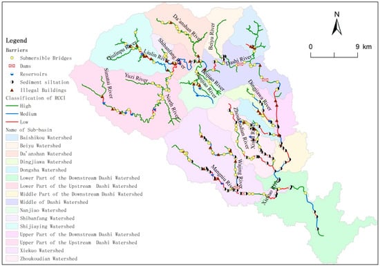 The assessment results shown by Figure 5 and Table 4 are as follows: (1) The seven catchments in the plain are all low connected, but there are some high connected segments with no barriers or few barriers of small size, such as submersible bridges and dams. The nine catchments are high connected in the mountain area except the lower part of the upstream Dashi Watershed. However, there are a few low connected segments because of reservoirs or illegal buildings; (2) the RCCI result of segments can reflect the various connectivity characteristics caused by a single barrier in different parts of a tributary. For example, there are 13 segments divided by 12 barriers in Mapaoquan River. In the 12 barriers, there are seven sediment siltations, four submersible bridges, and one reservoir. The lengths of sediment siltation range from 226 m to 880 m. The length ratio () of sediment siltation to segment ranges from 0.27 to 1.00, with an average of 0.75. Correspondingly, the RCCI is low with values from 0.65 to 0.85, with an average value of 0.72. However, the average length of the four submersible bridges is 7.25 m, the average is 0.06, and the average RCCI is 0.97. It could be concluded that (the ratio of the barrier length to the segment) has a negative effect on segment RCCI values. Therefore, RCCI is affected by the barrier type. Three high connected segments are presented in two sites of its downstream area and one site near Xisha River. Thus, we concluded that connectivity is clearly affected by the type and shape of the barriers in the river channel.
