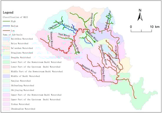 The range of the tributary RCCI value is from 0.74 to 1.00 in Dashi Watershed based on the calculation of the RCCI model. The RCCI values are classified according to the standard in Section 4.2.1. The results show that the number of low connectivity tributaries is 41%, which are mainly in the catchments located in the middle and south of the watershed. The number of medium connectivity tributaries is 11%, and the high connectivity tributaries accounts for 48%, which are mainly within catchments located in the northwest of the watershed (Figure 6).