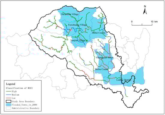 Flood hazards might happen due to barriers existing in the river channel. Results of the RCCI model are validated by two historical flood events of 2000 and 2012 in the watershed. The RCCI values are firstly mapped to match spatially to the town locations, with the 2000 flood events reported from the “Report of Flood Control Planning in Fangshan District” []. The flood events occurred in Da’anshan Village, Nanjiao Village, Shilou County, Fozizhuang Village, Hebei County, Chengguan Street, Liulihe District, and other towns on 4 July 2000, where the RCCI values of the segments are mostly small in the plain area (Figure 7). In addition, the RCCI average values of each town are counted by the spatial analysis tool in the Arcgis10.0 platform before they are classified according to the standard in Section 4.2.1. The Pearson correlation analysis between the average value and the binary variable whether the town is flooded is conducted by SPSS 19.0 (International Business Machines Corp: New York, NY, USA). The rules are set as follows: High connected is set as 0, medium connectivity is set as 1, and low connected is set as 2. As for the binary variable, it is set as 1 if the town is flooded, and else set as 0. Results show that there is a medium correlation between the flooded town and the RCCI classification (correlation coefficient, = 0.405, p < 0.05, n = 18). Therefore, it indicates there is a relationship between the low connectivity and the flooded towns.