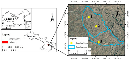 Location of the three experimental blocks in Huining County, Gansu Province, China.