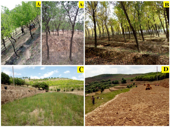 In total, three blocks, each housing all five different treatments, were selected (Figure 1). Blocking was done to reduce the unexplained variability (i.e., to reduce the error). Differences in and pH under each treatment among the three blocks are presented in Table 1. One should note that it is a good sign that the blocks appear to have an influence on the results, as this variability can be removed from the unexplained variability. In forested treatments, soils were sampled from nine 10 m × 10 m plots that were arranged at a 10 m spacing both up–down and on the contour in the middle slope, while in the abandoned and the cultivated treatments, soils were sampled from three or five 10 m × 10 m plots arranged at a 10 m spacing along the horizontal contour, due to the limited areas of these lands. In a small block, if the replicated plots could represent the whole block, this non-random sampling method was also feasible, as has been advocated by several other researchers (e.g., [15,23,29,30]). To improve the comparability between the forested treatments and the non-forested treatments, a majority of the non-forested lands were sampled in the vicinity of forested lands. In each plot, three 1 m × 1 m sub-plots, spaced along the diagonal (both ends and midpoint), were excavated to a soil profile depth of 1.0 m, a depth representing the extent of vertical root distribution of herbaceous and woody plants in this region [9,31]. In the poplar treatment, the physical barrier of litterfall (Figure 2B) contributed to a lack of vegetative cover and low plant diversity [32], and the above-ground biomass (AGB) was not collected. In the apricot treatment and abandoned treatment, the living AGB was collected by the harvest method, following earlier studies [33]. In the cultivated treatment, there was a lack of living AGB due to the growth of crops and regular weeding.