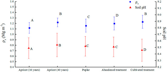 The soil bulk density () and pH across the 0–1.0 m depth soil profile under different treatments. Different uppercase letters show differences among the 16- and 40-year-old apricot treatments, the poplar treatment, abandoned treatment, and cultivated treatment at p ≤ 0.05. Bars indicate standard deviation of the means.