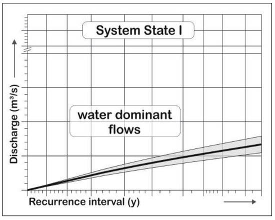 Considering water dominant flows, the sediment storage capacity is not of particular importance. The magnitude-frequency relationship can easily be developed in the case of sufficient data. There is a clear relationship between recurrence interval and discharge, and therefore the discharge can be calculated for a given frequency within a range of accuracy. If a catchment behaves in that way, we may label this system as state I (Figure 1).