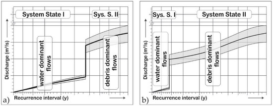 If a catchment shows a high disposition to mobilize sediment, the sediment storage cannot be neglected and modifies strongly the system output. This disposition may vary in time and between different catchments, depending on topography, geology, and vegetation, for example, leading to different thresholds when debris dominant flows are initiated. Using discharge as a proxy, the threshold to produce debris dominant flows may be exceeded with discharges of a very low frequency up to a very high frequency. Analyzing event cadasters, researchers have distinguished catchments of different behavior [7]. Some catchments produce periodic debris dominant flows, whereas others show irregular behavior, creating several huge discharges within a short time span followed by a period with only water dominant flows. It can be deduced from this behavior that if a catchment-specific threshold of discharge is exceeded, the sediment storage controls the resulting flow type, and we may therefore label this system as state II (Figure 2). The system state II’s characteristic is that peak discharges exceed the expected peak discharges of water dominant flows by a factor of more than 2 up to 50. This implies that above the threshold no water dominant flows occur.
