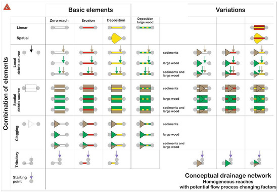 Based on the experience presented in documentation on torrential disasters and the implementation of the results obtained from the project “Erosion, Transport in Alpinen Systemen” ETALP [8], a concept was developed to illustrate the main geomorphic features together with the varying dominant flow types along the drainage network. This network is divided into homogeneous reaches based on the assumption that the driving geomorphic factors remain constant within a homogeneous channel reach. In the conceptual drainage network, such a channel section can be seen as an element. Basic elements (zero reach, erosion and deposition reaches) can be combined with potential debris and large wood sources, like local debris sources, spatially distributed debris sources, clogging, and tributaries. The method is open to variations of the selected elements (Figure 3).