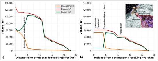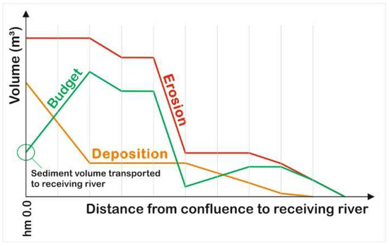 To quantify the erosion and the deposition volume for the homogeneous reaches, different methods can be applied. If airborne laser scanning (ALS) data are available before and after a torrential event, the difference of the digital elevation models (DEM) can be calculated and projected to the channel reaches. Otherwise, field survey methods must be executed as suggested by [9,10], where geometrically derived erosion and deposition volumes are estimated, taking different sediment sources along the channel into account. Empirical formulas can only be used as a rough estimate of the total sediment load [11,12,13,14,15,16], without considering variable sediment sources along the drainage network. Erosion and deposition volumes are cumulated in the downstream direction along the main channel and the net volumes are calculated (Figure 4). If the budget (erosion minus deposition) is increasing, erosion rates are higher than deposition rates and vice versa. A constant budget is achieved by equilibrium of erosion and deposition rate. At the downstream end of the channel, the budget indicates the sediment volume that is transferred to the receiving river. This very practical method can also be used to optimize and visualize the effect of mitigation measures.