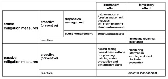 Mitigating torrential hazards has a long history. Depending on financial resources, available building material, worker expertise, construction material, technical standards, and facilities, several measures for sediment management were developed. Two types of mitigation measures can now be distinguished [17]: active measures and passive measures (Figure 5).
