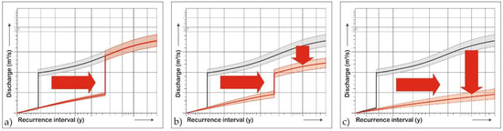 Possible adaptation of the magnitude–frequency relationships through mitigation measures: (a) solely shift of the transition; (b): shift of the transition and lowering the magnitude in system state II and (c) total transition from system II into state I.