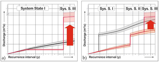 System transitions due to failure of mitigation structures or exceptional torrential events with cascading effects: (a) possible transition due to failure of structural measures for event management; (b) possible transition due to failure of structural measures for disposition management.