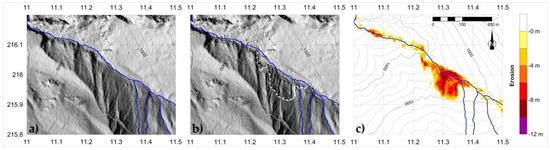 Comparative airborne laser scans before and after the event: (a) DEM of the year 2012, (b) DEM 2015, and (c) difference of the DEMs showing the landslide area (data source: Austrian Torrent and Avalanche Control).