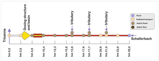 Using the elements of the conceptual drainage network, the situation before and after the landslide can be visualized. Figure 10 shows the situation before 04:00 CET. Due to channel bed erosion, the flood that originated in the headwaters was transformed to a bedload transport process. Downstream of hm 20.9, features of a debris flood were documented. The dosing structure with an associated basin at hm 3.9 retained the main part of the transported sediment, allowing only bedload transport to develop downstream of the structure. The system state I remained unchanged.