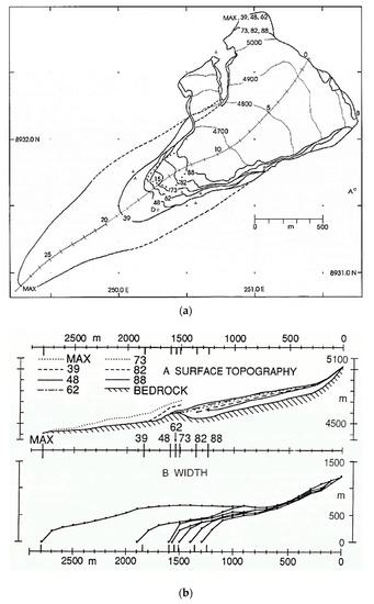 | Distance from Headwall to Terminus (m) | Terminus Elevation (m) | Surface Area (106m2) | Volume (106m3) | ||||||
