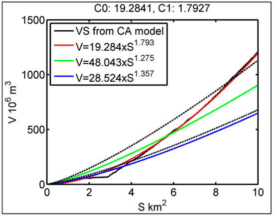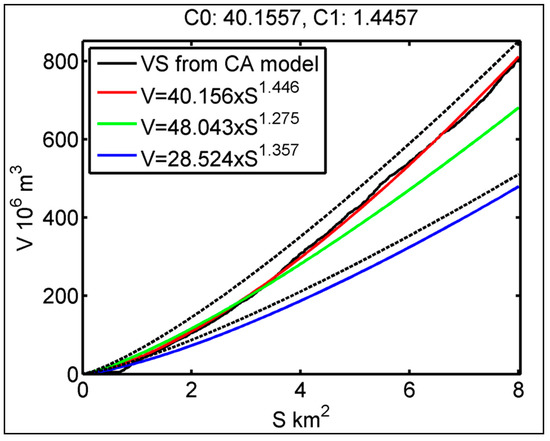 4.3.2. The V-S Scaling of QUE from the Cellular Automata (CA) Model
