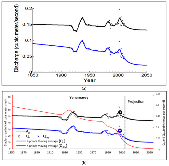 - Mark, B.G.; Seltzer, G.O. Tropical Glacier Meltwater Contribution to Stream Discharge: A Case Study in the Cordillera Blanca, Peru. J. Glaciol. 2003, 49, 271–281. [Google Scholar] [CrossRef]
