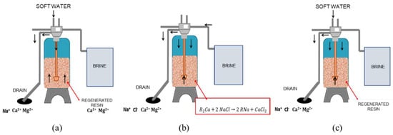 Spent brine generation. The softening program consists of a 3-step process: (a) A backwash (14 min) where fresh water is introduced to the resin from the bottom to the top; (b) resin regeneration (50 min) where a brine solution is used to liberate calcium and magnesium from the resin and generate de sodic character; and (c) rinse (6 min) to liberate the residual sodium chloride, calcium, and magnesium.