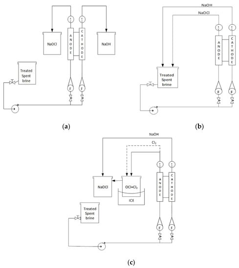 In the recirculation process (Figure 2b) pretreated rejection brine was injected into the electrolytic cell, the NaOH and NaOCl outlets were both connected to the brine tank and the process was recirculated for 4 h. The same variables were monitored as 2.4.1.