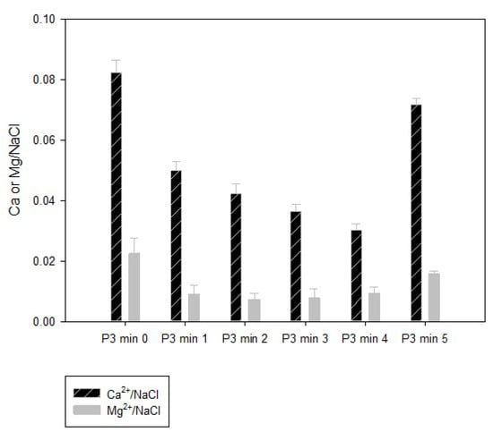 It is widely known that in the alkali-chlorine generation process the brine quality is the main factor in achieving an efficient process. The challenge of this process was to treat spent brine with high concentrations mainly of calcium, magnesium, sulfate, and alkalinity. The brine generated at stage 3 presented an average amount of 2.7% of sodium chloride (Figure 1) and was characterized in terms of calcium, magnesium, and total hardness. The relation among the principal ions responsible for the hardness and NaCl content are evidenced in Figure 3. The requirements needed for EC process are 250 g kg−1 for NaCl, and less of 30 µg L−1 of calcium and magnesium principally [,].
