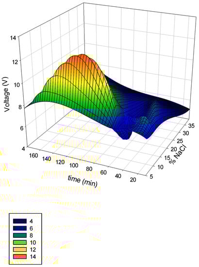 Voltage variation as a function of time and % NaCl in the initial screening.