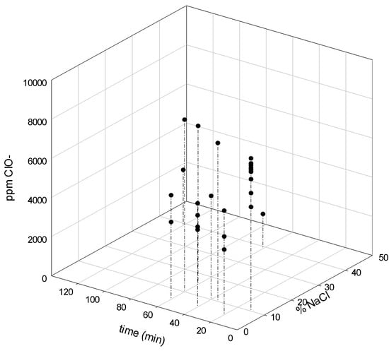 Theoretically, saturated NaCl solutions should be fed to the anode compartment to assure high coverage of chloride ions at the surface of the electrode []. Pure NaCl was used for these assays (Figure 4). It is clear that salt concentration has an appreciable effect on voltage, such as operational time. The highest voltage was reached at a NaCl concentration of 20% and an operation time of 120 min. The dependence of time in operational parameters was evidenced and the hypochlorite generation was followed in terms of salt concentration and time (Figure 5). When using membrane cells, the feed brine concentration should be between 170 g L−1 to 300 g L−1 []. These studies ranged from the regular salt concentration registered in the brine effluent (5%) to the highest recommended by the cell manufacturer (30%). It is noticeable an increase in hypochlorite concentration when high salt concentration was used. At 60 min a stationary state was approached. A maximum of 6000 mg L−1 was attained at that time using a 15% salt solution. Regarding low NaCl concentration (5%), hypochlorite production reduced significantly, as low as 3000 mg L−1. Both values are in the range of the reported hypochlorite production using commercial cells (Table 1).