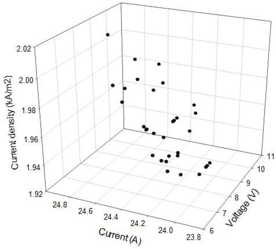 Finally, current density calculated as a function of voltage and current is shown graphically in Figure 6.