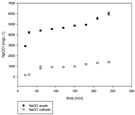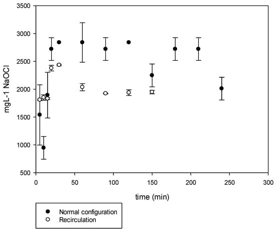 In order to obtain higher concentrations of NaOCl, a third set of experiments was performed. Similar operational conditions as the two-previous set of experiments were established; however, the hydraulics was modified to recover chlorine in gas (Cl2) and bubble it back to the solution. The NaOCl and NaOH were diverted back to the spent brine and recirculated. With this experimental set, a total concentration of NaOCl of 7400 mg L−1 was obtained (Figure 9).