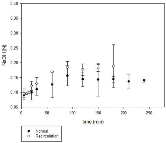 The results regarding alkali production are shown in Figure 8. The concentration of sodium hydroxide obtained was of 0.13 N, the maximum concentration was attained at higher production time (90 min) compared to hypochlorite production; corresponding to 0.52% w/v. The reported values for a regular process are approximately 30 to 33% of NaOH []. Based on current technology, the highest concentration of sodium hydroxide that can be produced in the membrane electrolyzer is 35% []. The commercial chlorine had a residue of NaCl which did not react in the electrolytic cell, for this reason and to maximize the available NaCl, a second set of experiments was performed by recirculating the obtained NaOCl and NaOH back to the spent brine tank [,]. This proposal was based in the new established issues with regards to reduce water consumption []. During brine recirculation the depleted brine from the electrolysis cells was resaturated. This saturated brine could be fed back to the process. Recycling is a common practice in membrane cells; recycling is also used to reduce the temperature and concentration gradients. Also, it is used to reduce oxygen content and it is more acceptable for its use on site [].