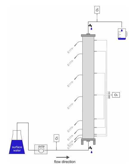 The experimental setup used within this study was adapted from Burke et al. [14]. Briefly, each column was equipped with oxygen probes and rhizome samplers in different depths, enabling periodic O2 measurements and sampling in order to define the hydrochemical conditions along the flow path (Figure 1). The sample ports of core A were placed in infiltration depths of 0, 3, 5, 13, 23, 38, 51, 76, 96, and 102 cm. The sample ports of core B were installed at infiltration depth of 0, 3, 5, 14, 24, 38, 51, 74, and 81 cm.