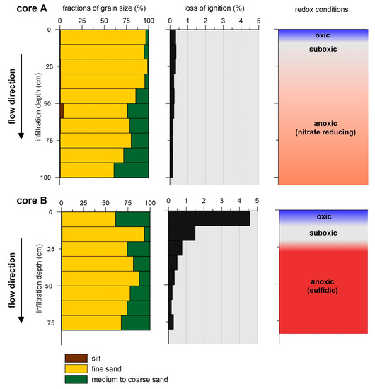 Information on sediment properties (fractions of grain sizes at the left; amount of particulate organic carbon (POC) in the middle) and hydrochemical conditions (at the right) observed along core A (upper part) and core B (lower part). With increasing infiltration depth (from top to bottom) the redox milieu changes from oxic (indicated by blue colours) to suboxic (indicated by grey colors) to anoxic (orange = manganese reducing; red = sulfidic).