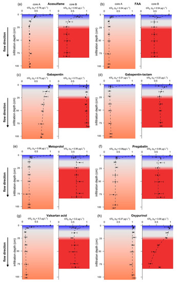 A similar picture—characterized by an efficient removal within the upper oxic zone paired with persistence within the remaining suboxic to anoxic part of the column—emerges for metoprolol, pregabalin and valsartan acid (Figure 3e–g). Based on field data, Nödler et al. [31] suggested valsartan acid to behave persistent during bank filtration. However, evaluating the data for valsartan acid of this study yielded the highest degradation rate constant of all compounds (31.5 day−1), corresponding to a half-life time of 0.5 h (core A). In accordance, Hellauer et al. [50] found valsartan acid to be efficiently attenuated after aeration of a test system, while persistence was noticed in an anoxic reference system.