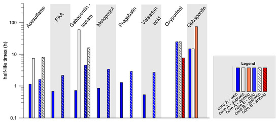 With regard to metoprolol, for which degradation rate constants of 19.7 day−1 (core A) and 4.9 day−1 (core B) have been observed, our results concur with results reported by other authors, who found a strong redox dependency of metoprolol degradation by means of laboratory experiments [18,67], and also confirm our previous findings [66].