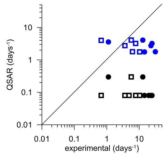 In order to classify the degradation rate constants observed during this study in relation to existing quantitative structure activity relation models, two QSAR models were picked and rates calculated accordingly and plotted against experimental findings (Figure 5). Firstly, the degradation expert survey BIOWIN 4 from the EPI Suite™ package (United States Environmental Protection Agency, Washington, DC, USA) [73] was used, which calculates time required for primary degradation, i.e., the change in molecular structure resulting in the formation of a new compound. Secondly, the predictive multi-linear regression model published by Bertelkamp et al. [74] was applied since it focusses especially on bank filtration data. Due to the fact that both models account for degradation under oxic conditions, only data derived from the upper, oxic layer of the columns were compared.
