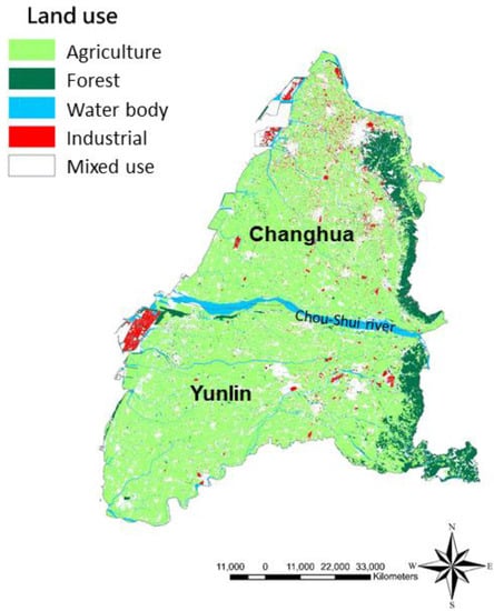 Inventory of land use in Changhua (upper area) and Yunlin (lower area) Counties. Chou-Shui river flows through and therefore forms a border for the two counties.