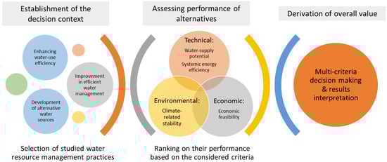 At first, the decision context with specific problem statement is structured, including framing, setting system boundaries, and identifying objectives and alternatives. Hereby, the alternatives were assessed in pairwise comparison regarding their performances to achieve the main criteria (attributes) for decision making. Scales of 1–12 (lowest to highest) were used for ranking the performance of the studied alternatives. Among the considered attributes, economic feasibility was the most important for a water management practice to be considered successful and sustainable, followed by water-supply potential, energy efficiency, and climate-related stability, based on the experiences from the authors. Simple multi-attribute rating technique (SMART) was then applied to assign weights for the studied attributes, and the rank order centroid weighting method (a linear additive model) was adopted in this study [21]. The total value of overall performance was calculated by