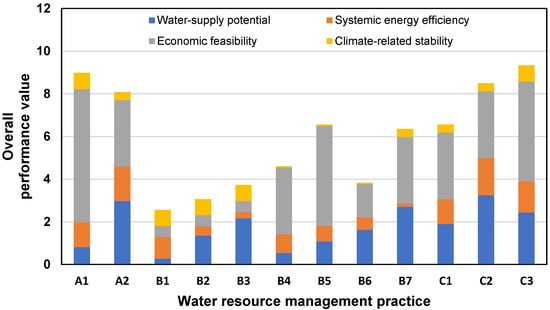 Overall performance value for studied water resource management practices. Ranking of importance: economic feasibility, water-supply potential, systemic energy efficiency, and climate-related stability. Weights of importance for the abovementioned attributes are 0.5208, 0.2708, 0.1458, and 0.0625, respectively, as determined by the SMART technique.