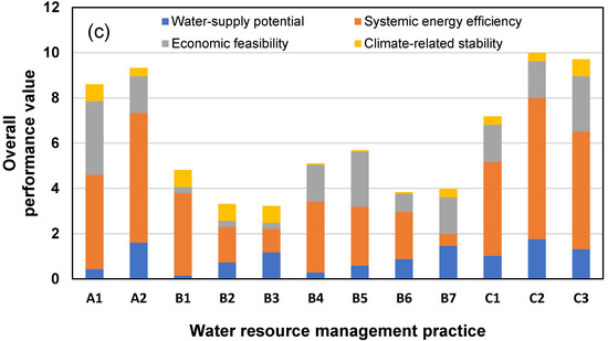 The MCDA results showed differentiated ranking for the 12 studied water resource management practices (Figure 3). A sensitivity analysis was also conducted to evaluate the influence of criteria weights on the MCDA results (Figure 4). Figure 4a shows the results from making all the criteria are equally important, while Figure 4b,c depict the results of ranking water-supply potential and systemic energy efficiency the most important criteria, respectively, considering those two criteria may be prioritized before economic feasibility. These scenarios were set for maintaining the stability in both water and energy systems, which could be attributed to the minimization of time delay associated with the constructions of new infrastructures (e.g., desalination or wastewater reclamation plants) [46].
