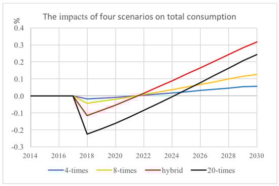 The impacts of four water pollution tax policy scenarios on total consumption (base year price).