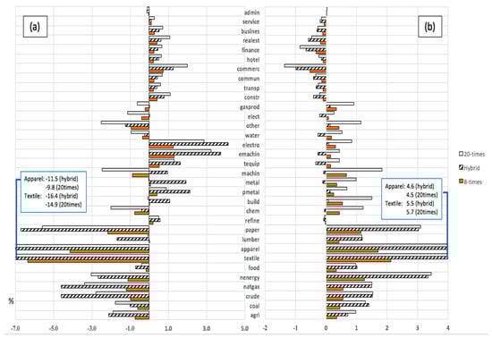 Compared to the 20-times policy, which taxes all industrial sectors at the same COD price, the Hybrid policy that puts the same high tax on COD-intensive sectors but a low tax on other sectors not only leads to a high COD discharge reduction that is almost equal to the reduction in the 20-times case (−2.41% versus −2.58% in 2018), but also has a bigger reduction in initial Consumption and a bigger increase in Investment. The intensity and concentration of COD discharge varies considerably among sectors (Table 1), and in the hybrid case, the discharge tax on high-concentration sectors forces them to make the biggest adjustment, while the low tax on the low-concentration, but economically important, sectors reduces the effect on the overall economy. Moreover, for the three main polluting industries (Textile goods, Wearing apparel and Paper products), the organic and non-organic pollutant (COD) in the hybrid case is cut down most among the different scenarios (Figure 7). Aggregate Consumption in the hybrid case falls by 0.12% in 2018 compared to 0.23% in the 20-times case, and Investment rises by 0.45% versus 0.41%. By 2030, the hybrid case GDP is 0.42% higher than the base case compared to 0.32% in the 20-times case.