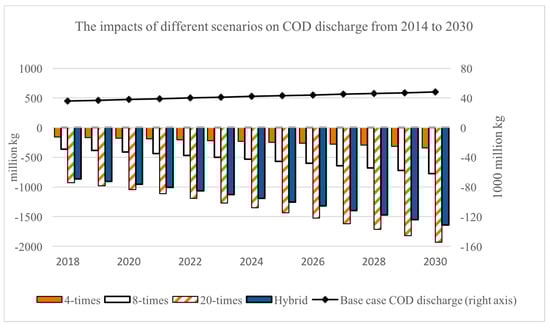 The impacts of different scenarios on COD discharge from 2018 to 2030. Negative values in the discharge change (left axis) mean that the total COD discharge is less than the total discharge in baseline (black line, right axis).