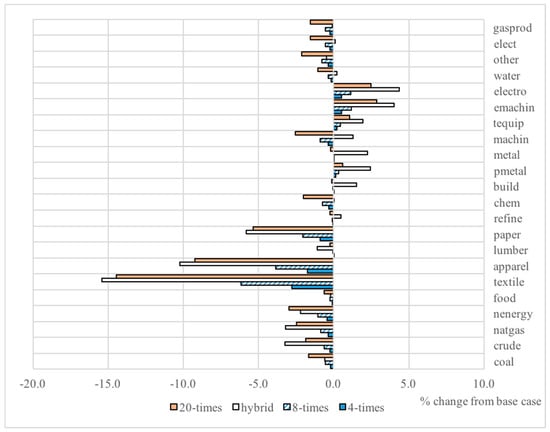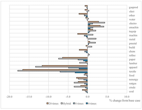 Another source of change in the composition of the economy is the industry price effect. The tax on COD discharge raises the costs to COD-intensive sectors such as Coal and oil mining, Food products and tobacco processing, and Textile goods. The general equilibrium impact on industry prices is shown in Figure 3 for the four scenarios for 2030; this includes the impact of the Pigovian tax and the impact of changes in the relative demand for consumption versus investment. For Textiles, the price rises by 1.0% in the 4-times case and by 5.7% in the 20-times case, while the price of paper rises by 3.1% in the 20-times case. At the other end of the impacts, the price of Commerce falls by 1.4% and Finance by 0.9% by 2030 in the 20-times case. The relative magnitudes of the price changes are similar between the 4-, 8- and 20-times cases—a big rise in the COD-intensive sectors and a decrease in services prices.