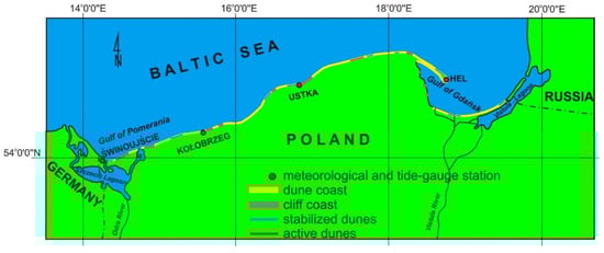 The Polish coast has a length of 500 km []. It represents two basic types of coastline: Dune and cliff (Figure 1) []. Out of this, 80% is constituted by dune, developing in the Holocene. These are usually sandy barriers with a height of 2 to 35 m. When it comes to dune shores, about 15% are constituted by accumulative stretches and around 35% by erosional stretches []. Cliffs occupy about 15% of the sea shore []. They were created during the Holocene and contemporary erosion of frontal moraines. Moraines are built of glacial clays, usually 10–95 m high, as well as fluvioglacial sand and clays accumulated in the form of ground moraines, most often 6–15 m high. A small part (a few %) in estuarine sections of rivers is constituted by a low coast of flood plains or organic accumulation. The height of this type of coastline is 0–5 m above sea level. Aeolian processes occur on all coastal types, especially in the beach zone. Aeolian processes are also observed on the slopes of dunes and cliffs.