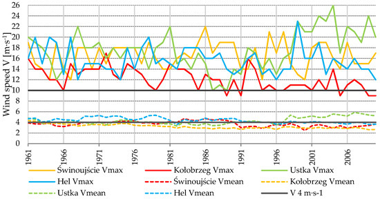 This study is based on daily hydrometeorological data from 1961 to 2010 concerning: Average, maximum, and minimum air temperature; average and maximum wind speed; the sum of atmospheric precipitation; and average, maximum, and minimum sea level. The data was provided by the Institute of Meteorology and Water Management in Warsaw (https://danepubliczne.imgw.pl). Data was collected from four coastal stations in Świnoujście, Kołobrzeg, Ustka, and Hel (Figure 1). One drawback of these stations is that they are located behind the coastal dunes, which means that recorded wind speeds may be lower than those actually occurring on the beach.