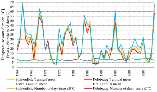 Each year, the average annual air temperature was similar across the entire Baltic coast zone. This confirms the rule that thermal conditions are more spatially homogenous than pluviometric and anemometric conditions. The average annual air temperature for the analyzed period decreased from 8.5 °C in Świnoujście, to 8.2 °C in Kołobrzeg, to 8.1 °C in Ustka and Hel. The occurrence of aeolian processes is limited by the freezing of surface settlements (tmax ≤ 0 °C). The most days with freezing temperatures were recorded in the eastern coastal zone in Hel, with an annual average of 28 days. Slightly fewer days with freezing temperatures were recorded in the remaining coastal zone, with an annual average of 23 to 25 days. The conditions for aeolian processes were particularly unfavorable in 1963, 1969, 1997, and 2010, when there were over 50 days with freezing temperatures recorded on the entire coast (Figure 4).