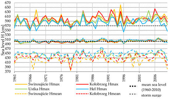 The annual dynamics of the maximum, average, and minimum sea level from 1961 to 2010 are very temporally and spatially varied (Figure 5). The average sea level ranged from 500 cm in Świnoujście to 504 cm in Hel. The absolute maximum sea level was 661 cm (Świnoujście—4 November 1995), and the absolute minimum sea level was 375 cm (Świnoujście—4 November 1979). The amplitude of sea-level fluctuations in the Polish Baltic coastal zone was, thus, 286 cm. It was only in 1966 that no excess of storm level Hmax > 570 cm was recorded at any of the stations. There were no limitations on the availability of beach sediments for aeolian processes on any day of that year.