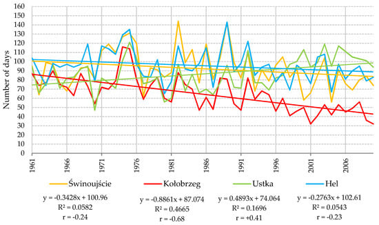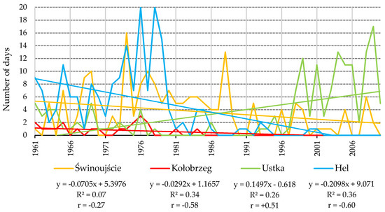 Analysis of the number of days per year with conditions conducive to intensification of aeolian processes revealed a statistically significant downward trend for Kołobrzeg and Hel (r ~ −0.6), and a statistically significant upward trend for Ustka (r ~ +0.5) (Figure 7). For Świnoujście, this trend was statistically insignificant.