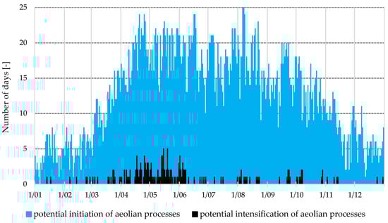 The occurrence of hydrometeorological conditions potentially favorable to initiation and particularly conducive to intensification of aeolian processes in the Polish Baltic coastal zone clearly depended on the seasons (Figure 8). During the cold half-year, especially from November to March, the number of days with conditions for the occurrence of aeolian processes was lower than from April to October. The cold half-year is the storm period, during which, despite higher wind speeds, storm surges are not conducive to aeolian processes, as they limit the availability of sandy beach sediments. Furthermore, during this period, there is a higher frequency of days with precipitation, as well as low temperatures causing ground frost. In the warm half-year, there are significantly fewer storm surges and days with precipitation, and no days with freezing temperatures. Conditions particularly favorable to the initiation and intensification of aeolian processes occurred especially in the spring, from April to June. At the beginning of spring, hydrometeorological conditions for the occurrence of aeolian processes were exceptionally favorable, as vegetation was not fully developed at the beginning of the season, and therefore did not limit the availability of sandy sediments for aeolian processes. Additionally, the inflow of dry masses of continental air from the Northeast were frequently recorded during this time.