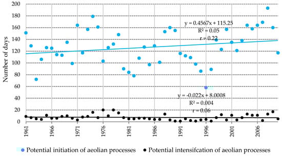 For the Polish Baltic coastal zone, analysis of the general trend in occurrence of hydrometeorological conditions potentially favorable to initiation and particularly conducive to intensification of aeolian processes (based on the maximum number of days per year with conditions for aeolian processes recorded by all four measurement stations) revealed statistically significant patterns (Figure 9). For hydrometeorological conditions potentially favorable to initiation of aeolian processes, an upward trend was observed. However, for hydrometeorological conditions particularly conducive to initiation of aeolian processes, a downward trend was observed. The hydrometeorological conditions from 1961 to 2010 were thus characterized by a certain increase in the number of events (days) with conditions for the occurrence of aeolian processes, albeit of relatively low intensity.